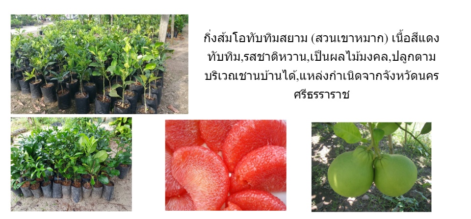 กิ่งส้มโอทับทิมสยาม (สวนเขาหมาก) เนื้อสีแดงทับทิม,รสชาติหวาน,เป็นผลไม้มงคล,ปลูกตามบริเวณชานบ้านได้,แหล่งกำเนิดจากจังหวัดนครศรีธรราราช ต้นสูงประมาณ 40-60 ซม.